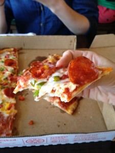 The pizza was pretty good – not amazing but good. It was the really thin cracker type crust.